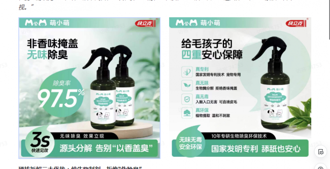 2. 国家发明专利,纯生物制剂分解臭源: “萌小萌宠物除臭剂的核心,是一项专门用于宠物除臭的国家发明专利技术。它的成分是纯生物制剂,通过微生物或酶解作用,从根源上分解尿液、粪便中的臭味分子,实现真正净化宠物生活环境。这不是简单的遮盖,而是彻底的祛除。”